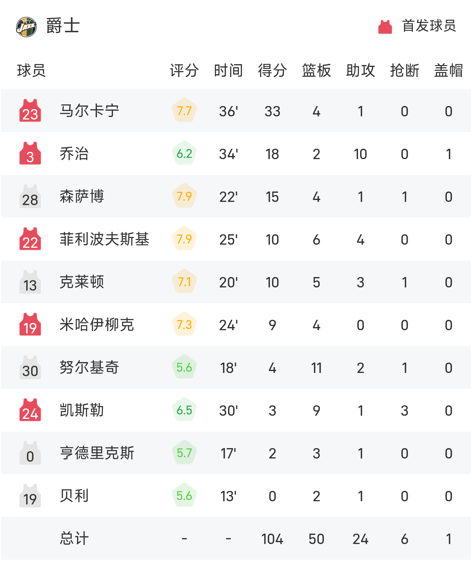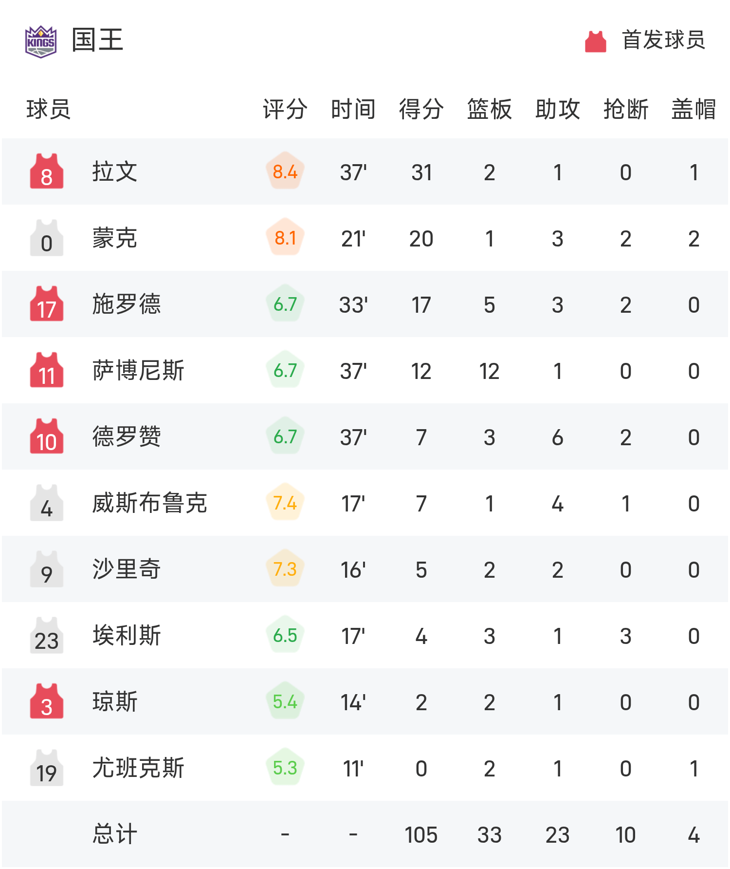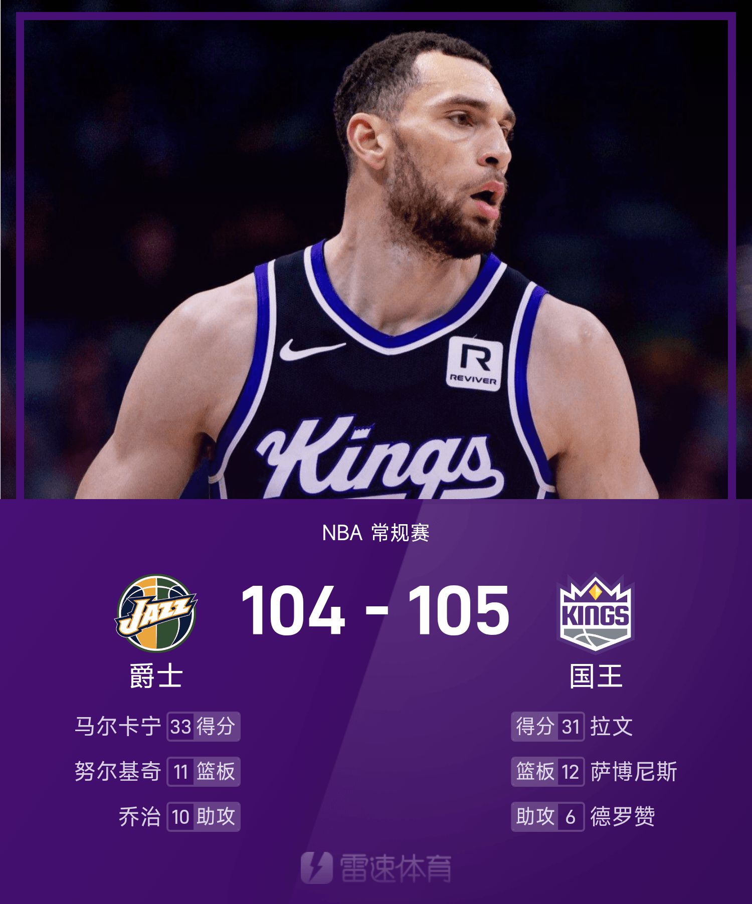 6686体育app10月25日讯 25/26赛季NBA 常规赛,国王对阵爵士。双方全场战罢,国王105-104战胜爵士。拉文得到31分2板1助率队取胜,马尔卡宁空砍全场最高的33分4板1助。