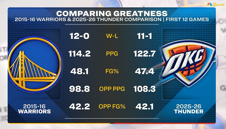赛后,美国电视台对比本赛季雷霆和2015-16赛季勇士前12场竞赛的数据: