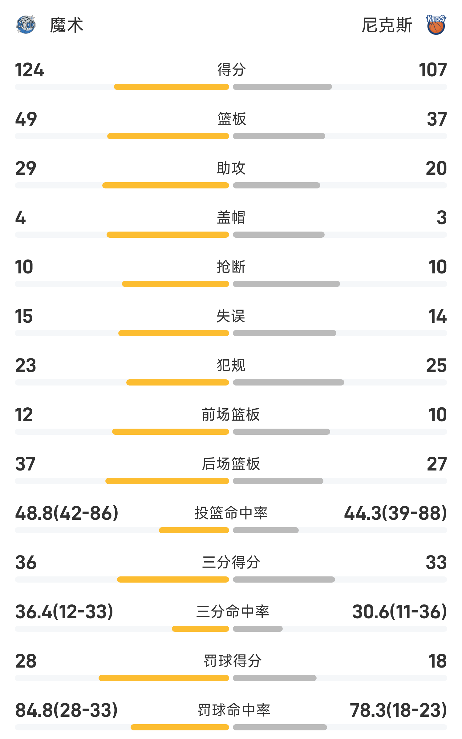 双方全场战罢,尼克斯107-124不敌魔术。