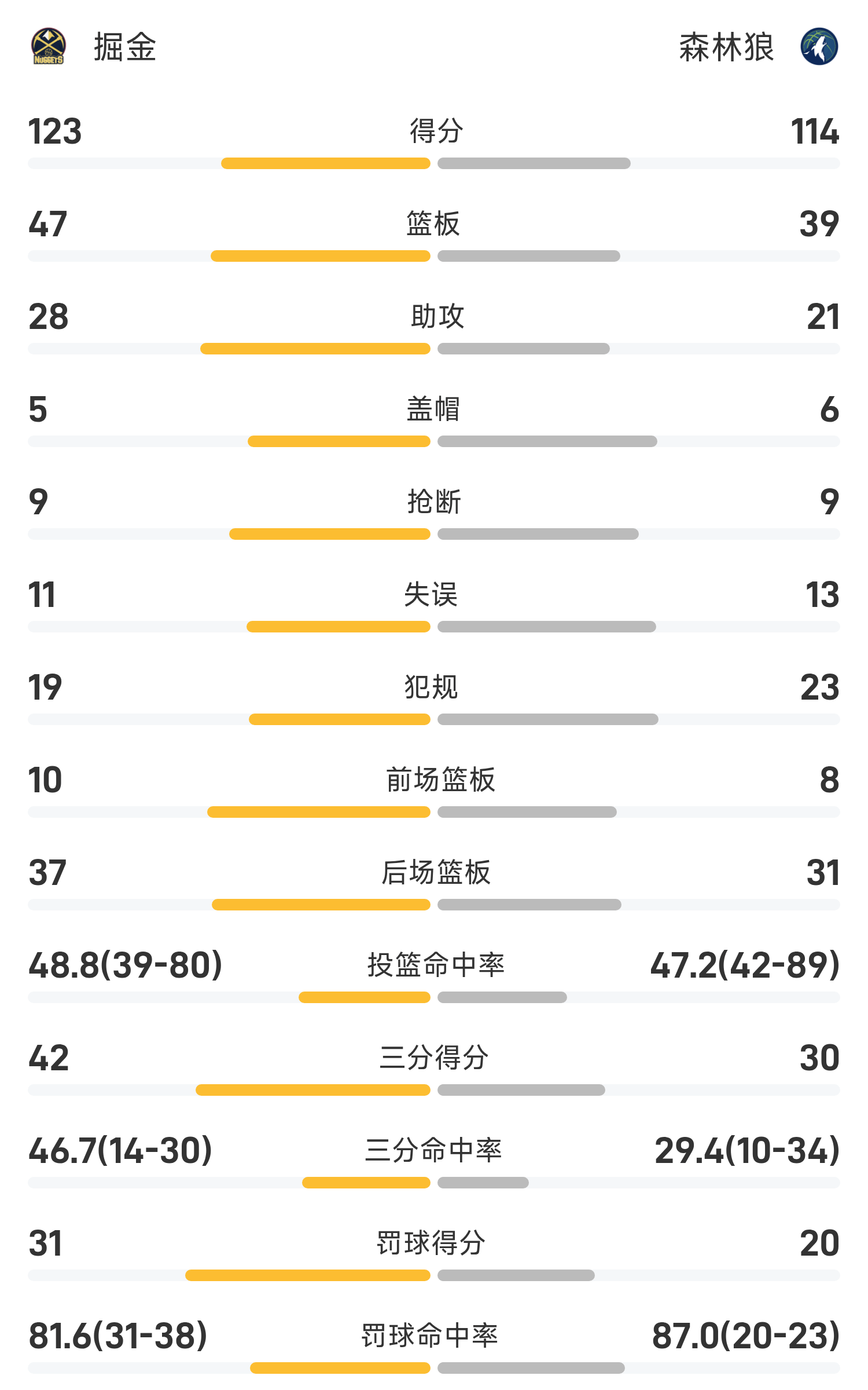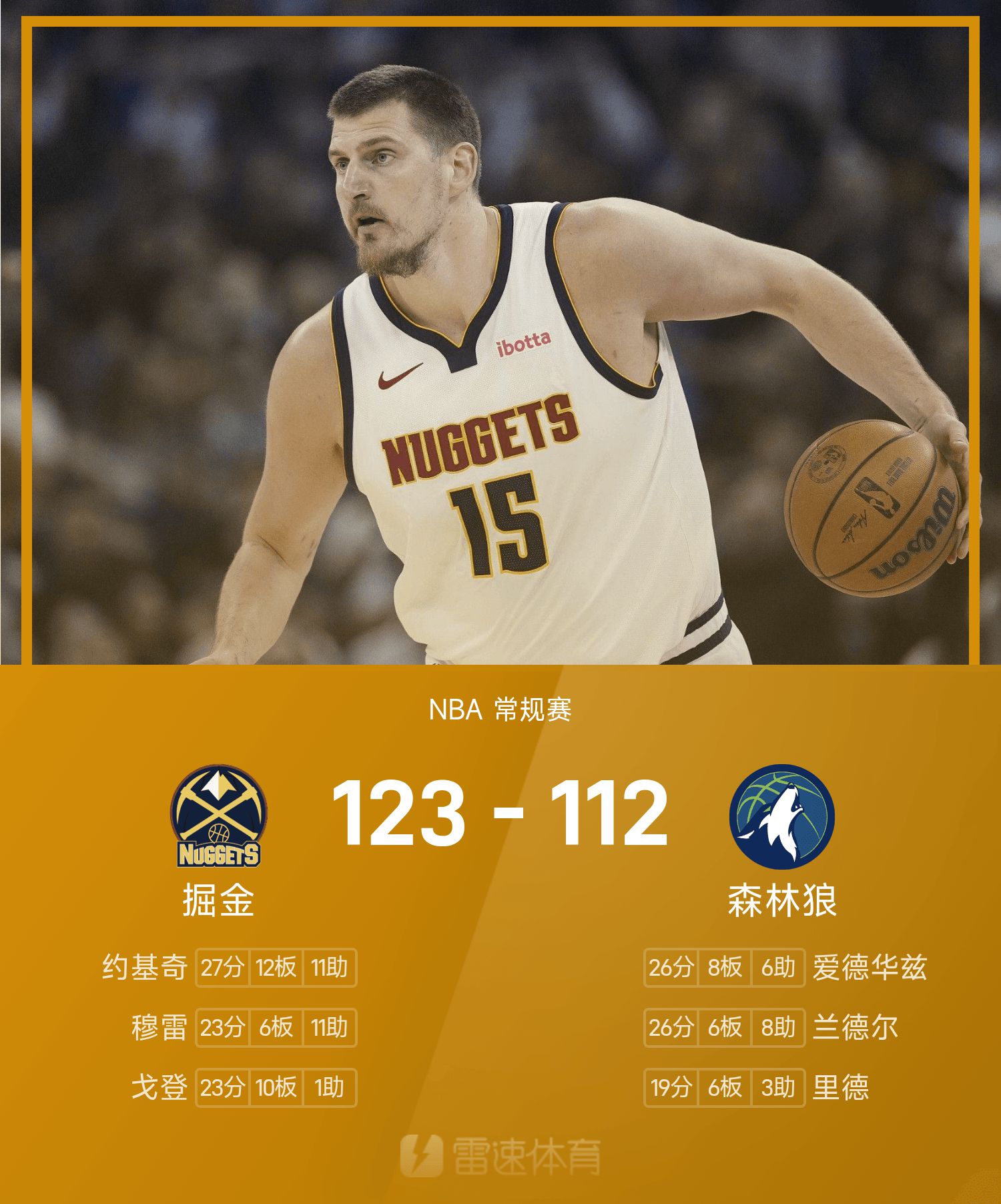 NBA战报:约基奇27分12板11助,掘金123-112击败森林狼