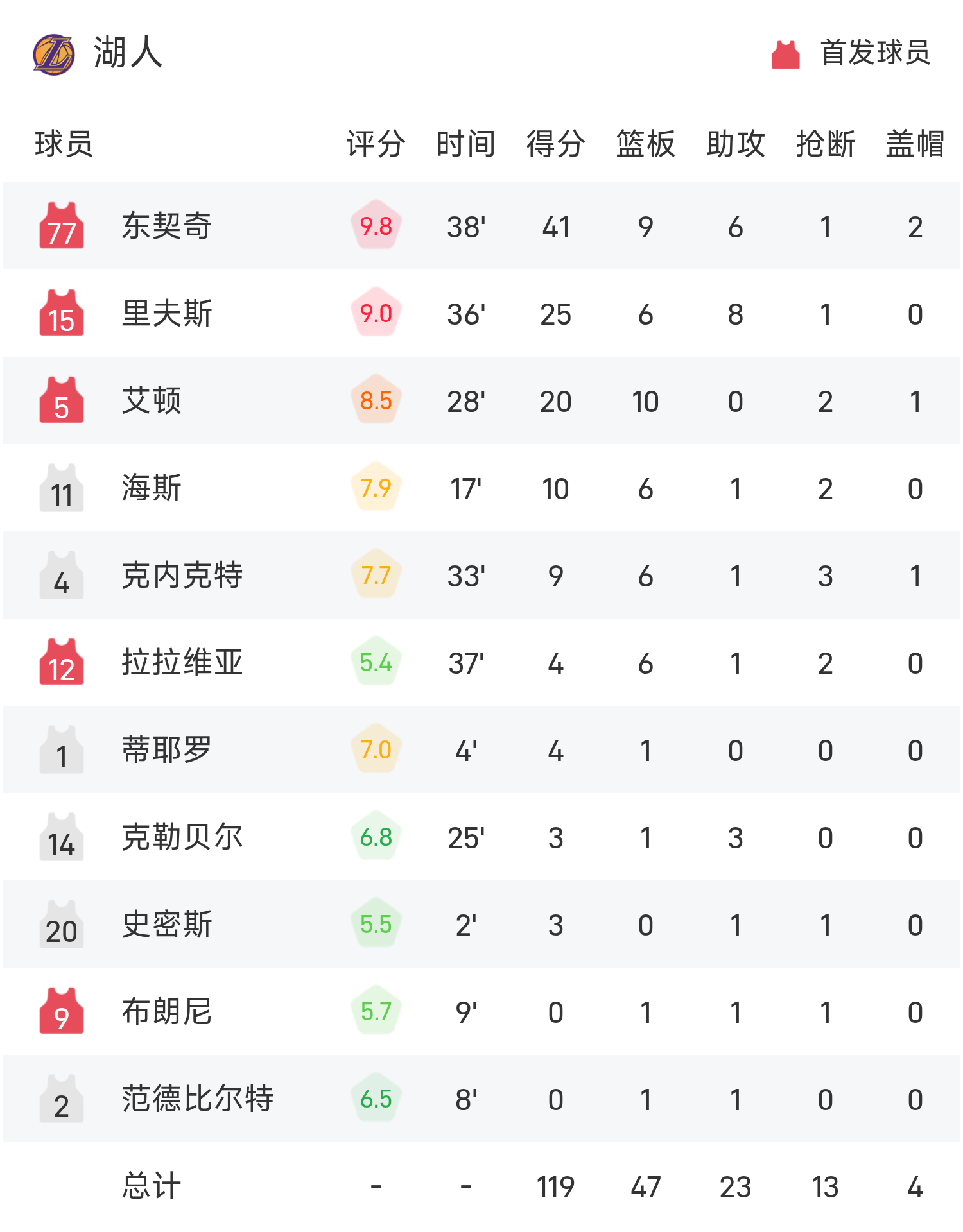 东契奇砍下全场最高的41分9板6助,率领湖人胜利取胜,字母哥空砍32+10无力回天。