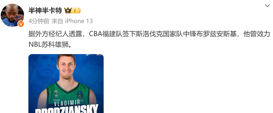 6686体育app11月5日讯 据国内媒体人“半神半卡特”报道,据外方经纪人透露,CBA福建队签下斯洛伐克国家队五号位布罗兹安斯基,他曾效力NBL苏科雄狮。