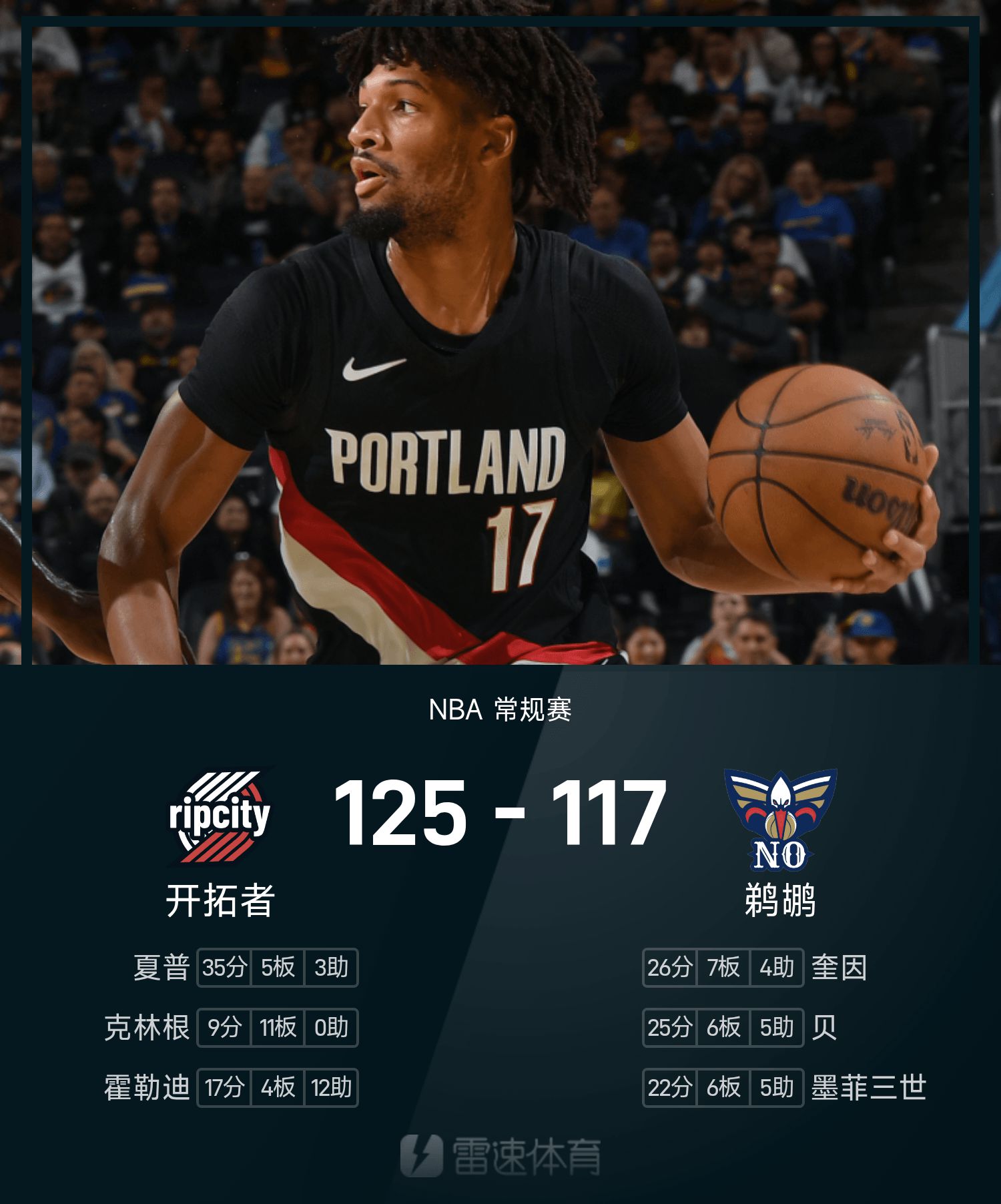 NBA战报:杨瀚森未登场&夏普35分,开拓者125-117鹈鹕