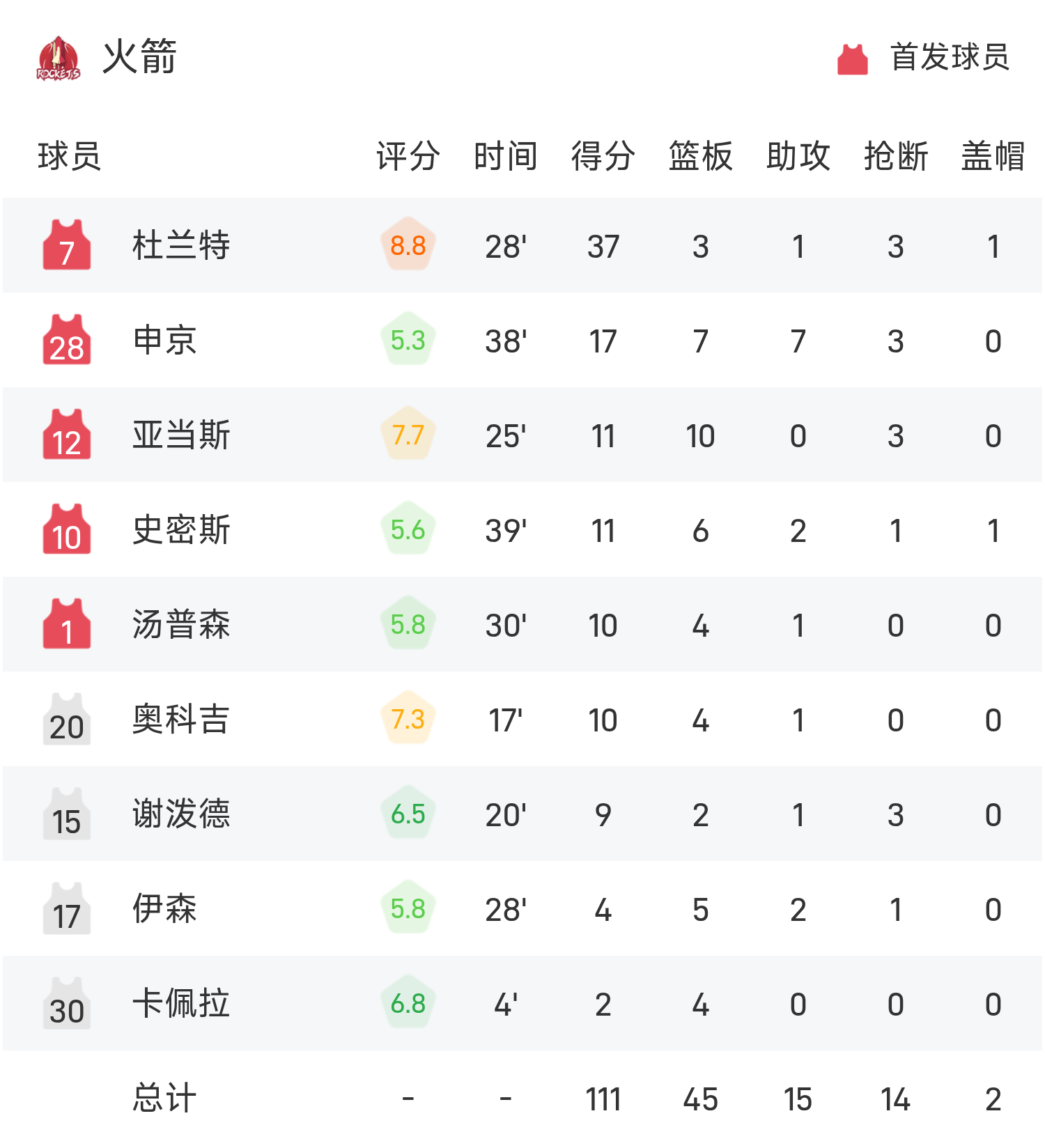 6686体育app10月25日讯 25/26赛季NBA 常规赛,火箭对阵活塞。双方全场战罢,火箭111-115不敌活塞。康宁汉姆得到21分7板9助率队取胜,杜兰特空砍全场最高的37分3板1助。