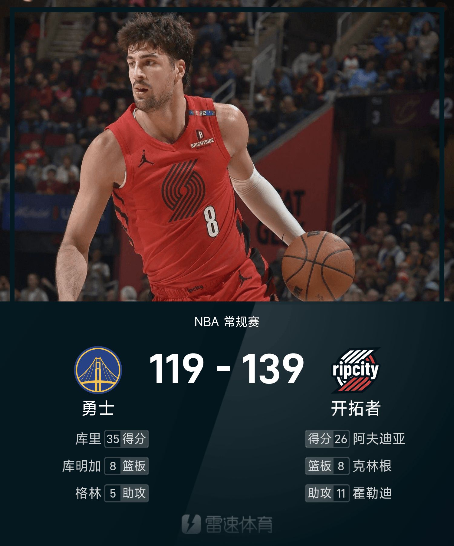 NBA战报:杨瀚森2分1板2帽,开拓者139-119勇士