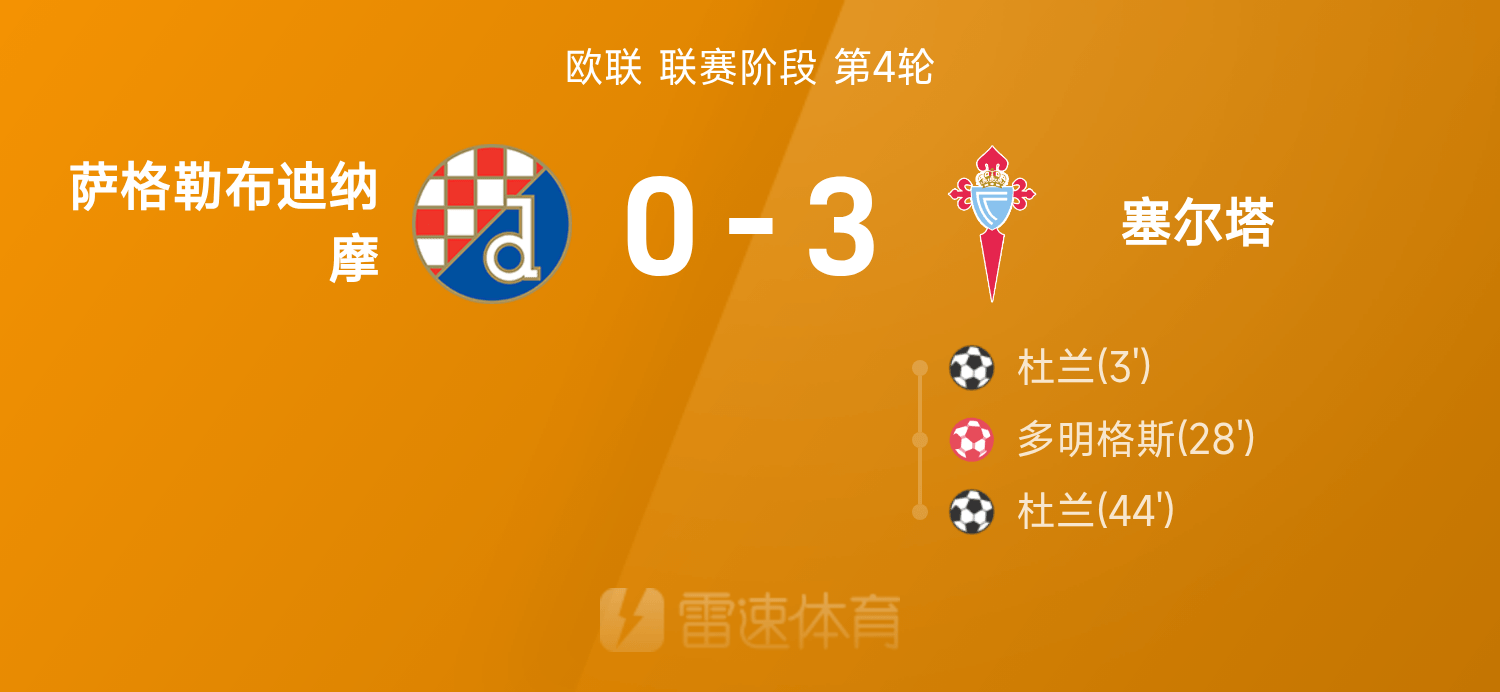 欧联战报:杜兰梅开二度,塞尔塔3-0完胜萨格勒布迪纳摩