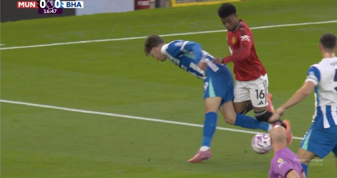 6686体育app10月26日讯 英超第9轮,曼联暂时2-0领跑位布莱顿。竞赛第15分钟,阿马德突入三秒区内被德库耶佩放倒,裁判员并未做出裁决。