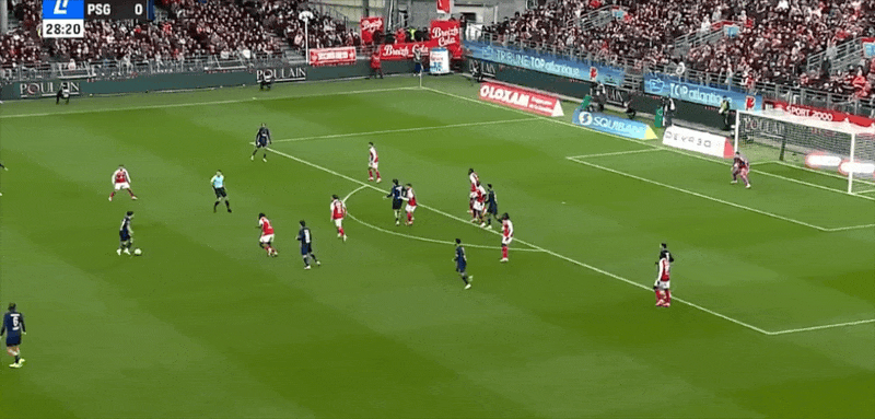 87’布雷斯特前场反击,巴尔德单刀机会失去平衡打门被扑