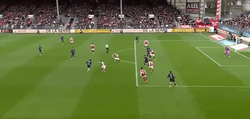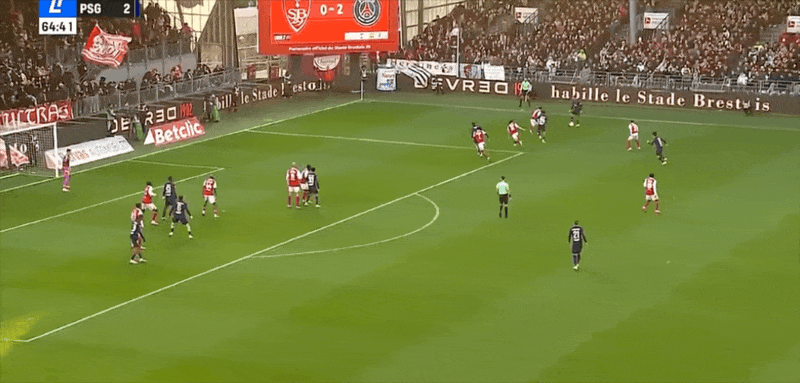 9’布雷斯特前场边线球开出,后点拉拉凌空抽射攻门直飞看台