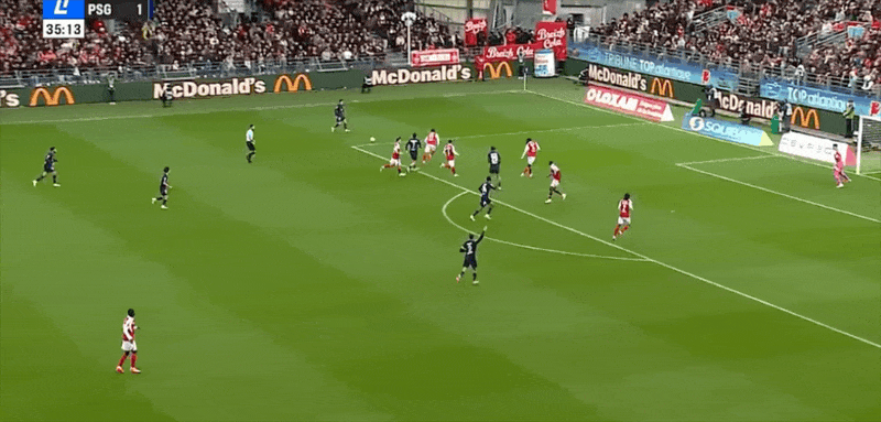 24’大巴黎前场打出流畅协作,马尤鲁单刀面对守门员吊射被扑
