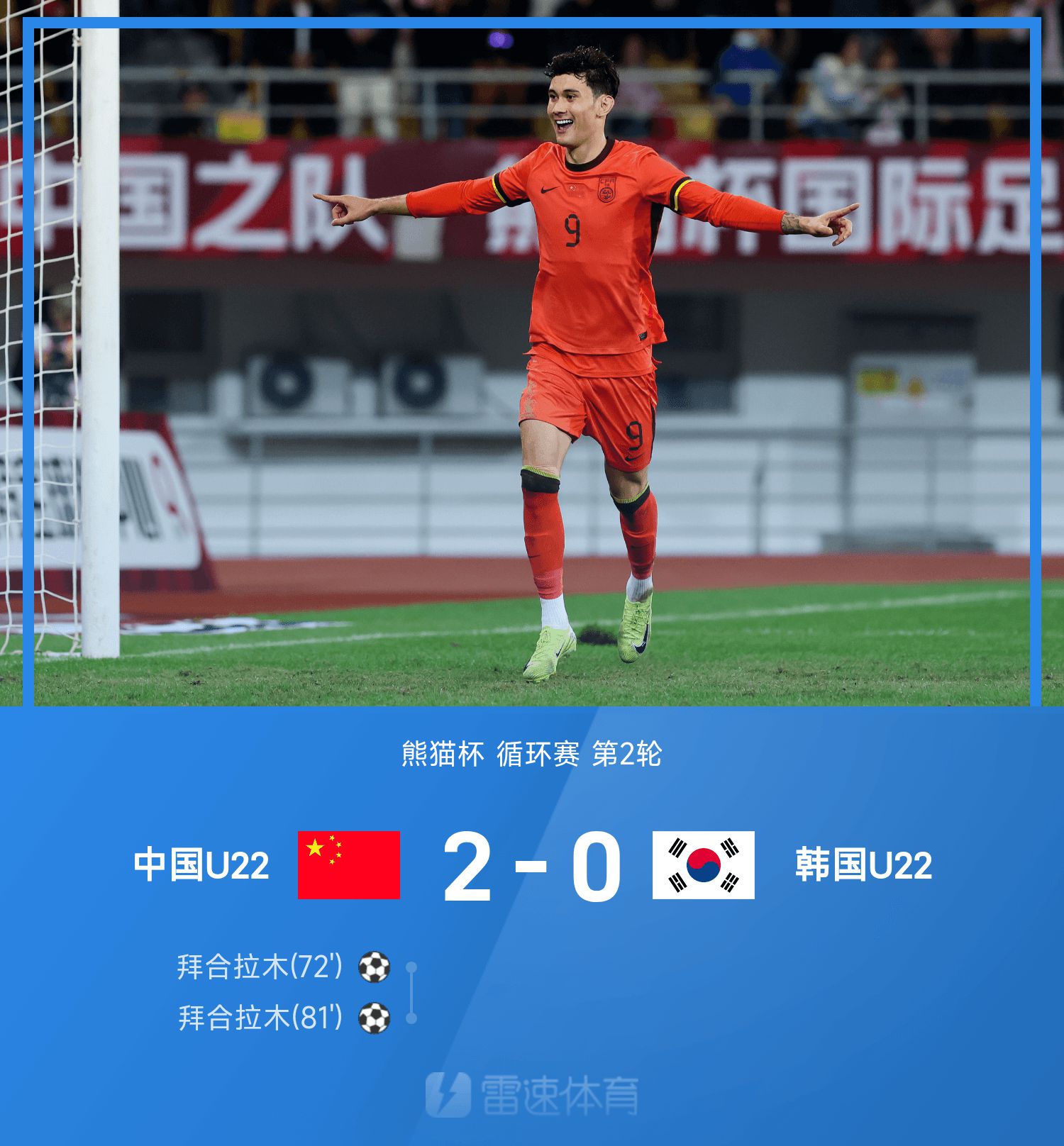 6686体育app11月15日讯 25赛季熊猫杯循环赛第2轮,中国U22对阵韩国U22。上半场,徐彬倒脚差错险些送礼,金容鹤错失良机;下半场,李镇全进球被吹越位在先,拜合拉木先是低射打破僵局,随后又脚后跟破门完成梅开二度。最终,中国U22 2-0完胜韩国U22。