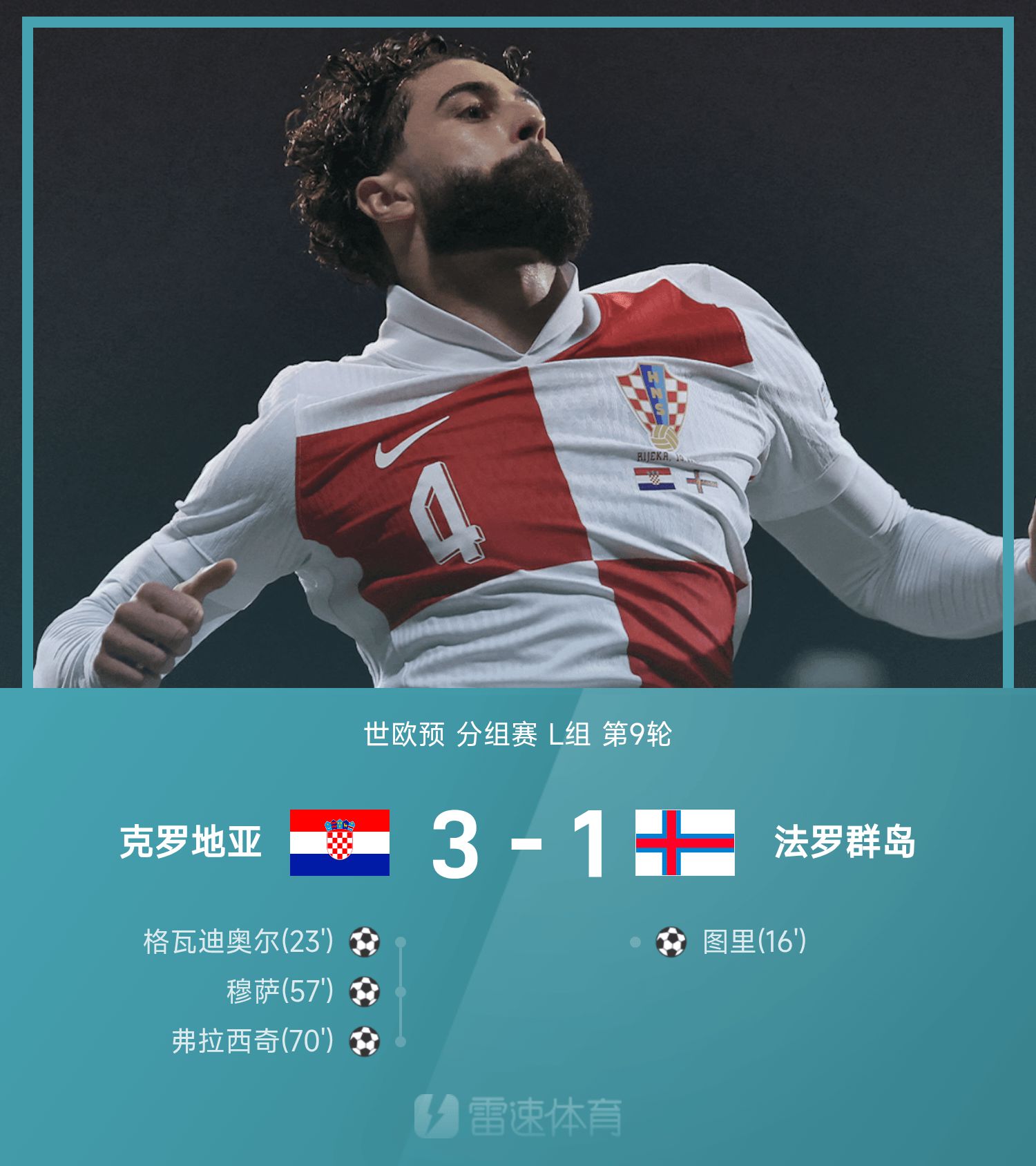 6686体育app11月15日讯 26赛季世欧预分组赛L组第9轮,克罗地亚3-1战胜法罗群岛。全场竞赛,图里折射破门协助法罗群岛客队场领跑位,随后格瓦迪奥尔、穆萨、弗拉西奇连续破门完成逆转,莫德里奇第61分钟被换下,克罗地亚提前晋级世杯赛。