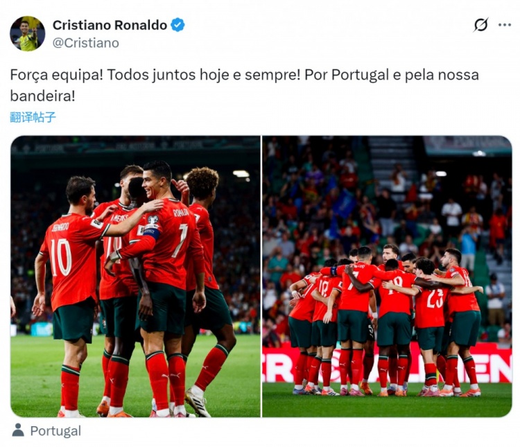 C罗写道:“加油葡萄牙!今天到永远,我们团结一心!为了葡萄牙,为了我们的国旗而战!”